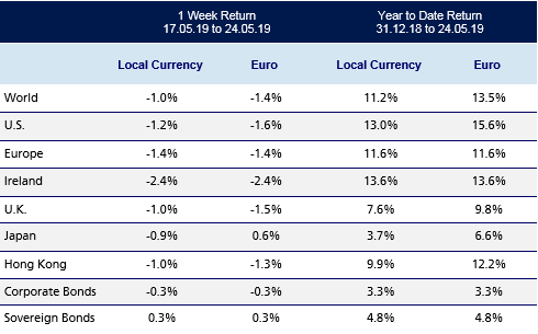 Major indices suffered their third weekly drop in a row, but still remain up strongly since the start of the year. Tech stocks in particular bore the brunt of selling as the concept of a ‘technological cold war’ came into vogue on the back of the US announcement giving federal powers to ban American firms doing business with foreign firms, most notably China’s Huawei. The latest FOMC minutes from the Federal Reserve appeared to have reinforced the growing market view that they are unlikely to raise interest rates again in 2019. The above all combined to push the benchmark 10 year Treasury note yield (which moves inversely to price) down to its lowest level since late 2017.