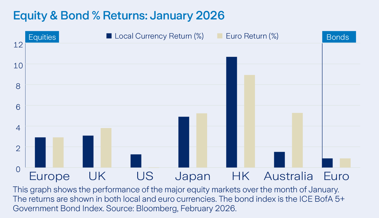 US equities rallied late in the month, fuelled by optimism around artificial intelligence, strong tech sector earnings, and expectations of ongoing Federal Reserve easing. Geopolitical events, including President Trump’s Greenland comments, pressured eurozone equities mid-month.
